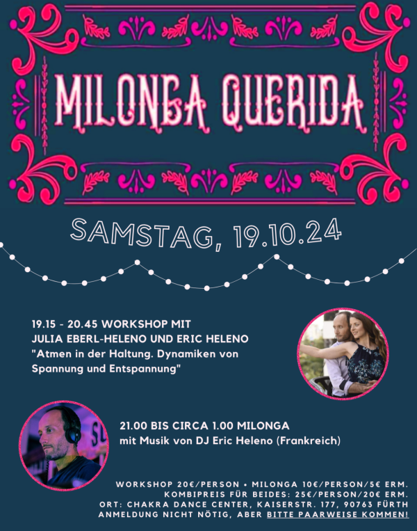 💰 Workshop 20€, Milonga wie immer 10€, Kombipreis für Milonga und Workshop 25€