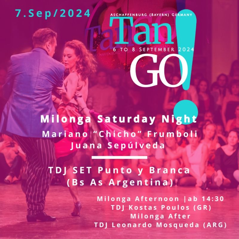 Milonga Saturday TanGO mit TDJ Punto y Branca (AR) Leonardo Mosqueda (AR) Kostas Poulos (GR) Bailan: CHICHO FRUMBOLI & JUANA SEPULVEDA (Argentina)