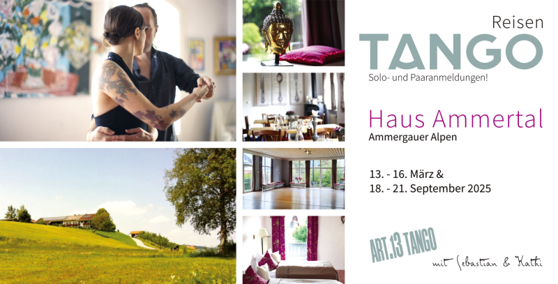 Tango tanzen und natürlich entspannen am Fuße der Ammergauer Alpen. Das Haus Ammertal und seine wunderschöne Umgebung sind als Ort für Rückzug, Meditation und Stille bekannt. 4 Tage lang tanzen und trainieren wir gemeinsam in einem lichtdurchfluteten Raum, mit direktem Zugang zum hauseigenen Garten und direktem Blick auf die majestätischen Berge. Zwischen den Tanz-Sessions ist genug Zeit für Entspannung, kleine und größere Wanderungen…vielleicht bis zum nahegelegenen See? Hier gibt es einen Barfußpfad, der einmal rund um (und durch) den See führt. Für noch mehr Entspannung sorgt die hauseigene Sauna. Ein echter Tango-Luxus-Genuss-Urlaub!