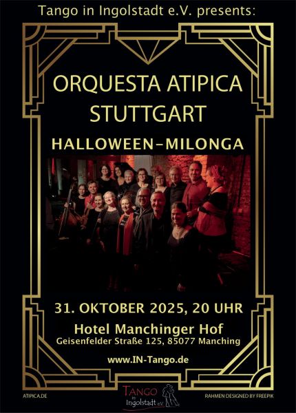 Verantwortlich im Sinne des Pressegesetzes: Katrin, im Kalender von Tango in Ingolstadt e.V.E-Mail des Verantwortlichen: info@in-tango.de Website: https://in-tango.de/event/halloween-milonga-mit-orquesta-atipica-stuttgart/ Falls dieser Termin nicht gestimmt hat, dann bittet der Seitenknecht um eine kurze Information, denn Möglicherweise brauchen die Veranstalter Unterstüzung: Kontakt zum 1. Seitenknecht