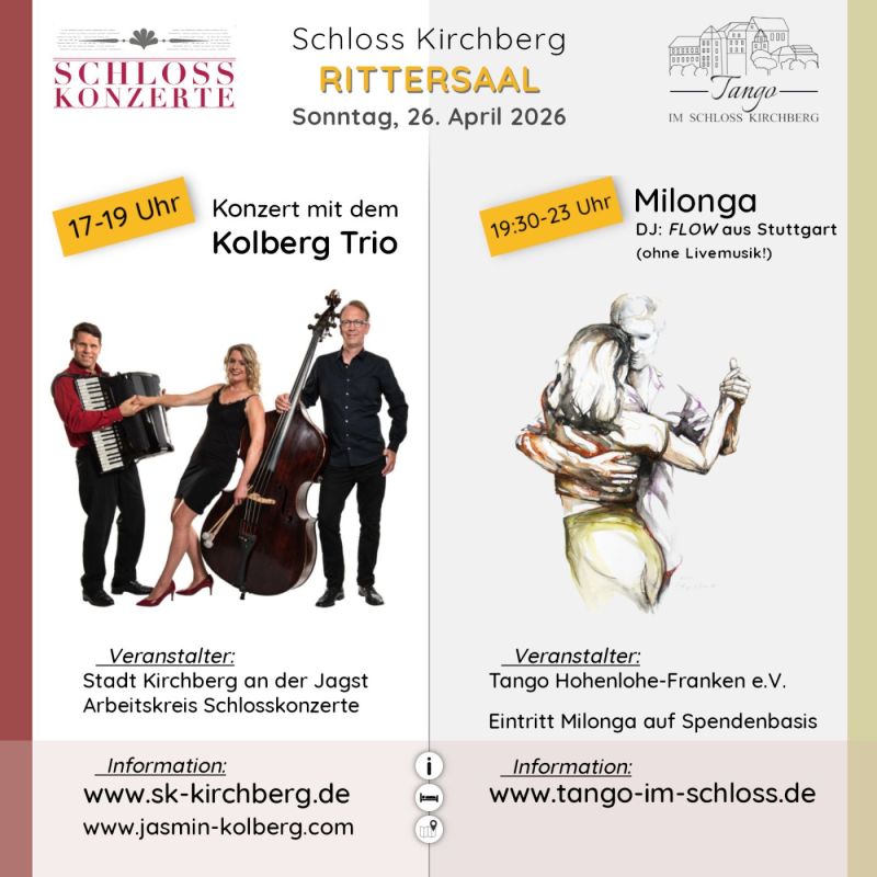 Der "Arbeitskreis Schlosskonzerte" veranstaltet am Sonntag, den 26. April 2026 von 17-19 Uhr, ein Konzert mit dem KOLBERG TRIO (Rittersaal).