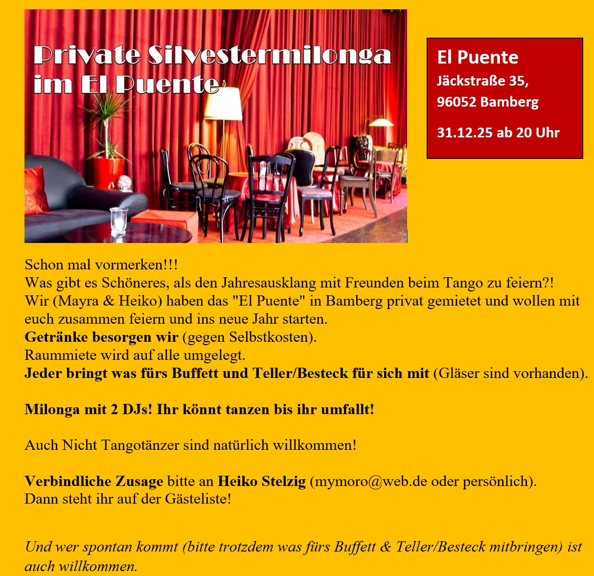 Verantwortlich im Sinne des Pressegesetzes: Heike und Mayra, im Kalender von 1.SeitenknechtE-Mail des Verantwortlichen: mymoro@web.de Website: https://www.tangobamberg.de/ Falls dieser Termin nicht gestimmt hat, dann bittet der Seitenknecht um eine kurze Information, denn Möglicherweise brauchen die Veranstalter Unterstüzung: Kontakt zum 1. Seitenknecht