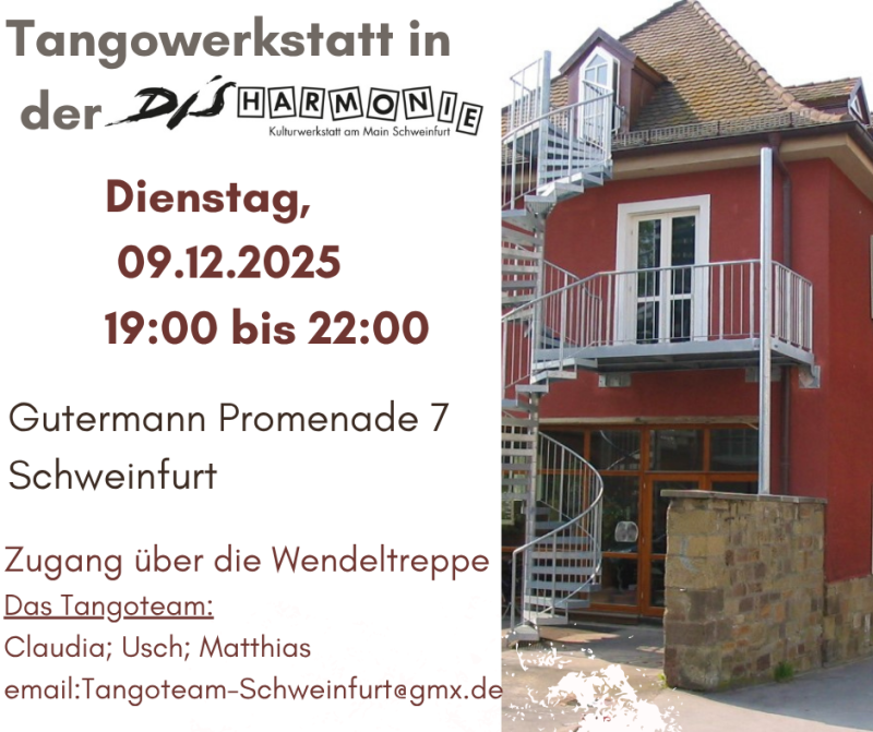 Wir laden wieder zu unserer monatlichen Tangowerkstatt in der Disharmonie Schweinfurt ein. Wir wollen wir uns wieder mit den Basics des Tango Argentino beschäftigen: