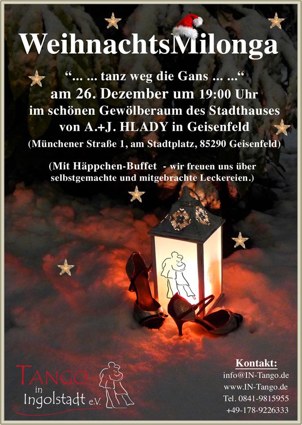 Verantwortlich im Sinne des Pressegesetzes: Katrin, im Kalender von Tango in Ingolstadt e.V.E-Mail des Verantwortlichen: info@in-tango.de Website: https://in-tango.de/event/weihnachts-milonga-geisenfeld/ Falls dieser Termin nicht gestimmt hat, dann bittet der Seitenknecht um eine kurze Information, denn Möglicherweise brauchen die Veranstalter Unterstüzung: Kontakt zum 1. Seitenknecht