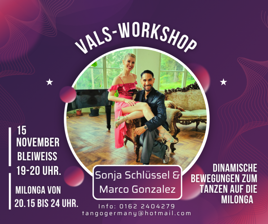 Wir werden an Dynamiken arbeiten, um unseren Tango-Vals in Milonguero Umgebung zu verbessern. Lasst es euch nicht entgehen, wie freuen uns auf euch!Vals-Workshop: “Dynamische
